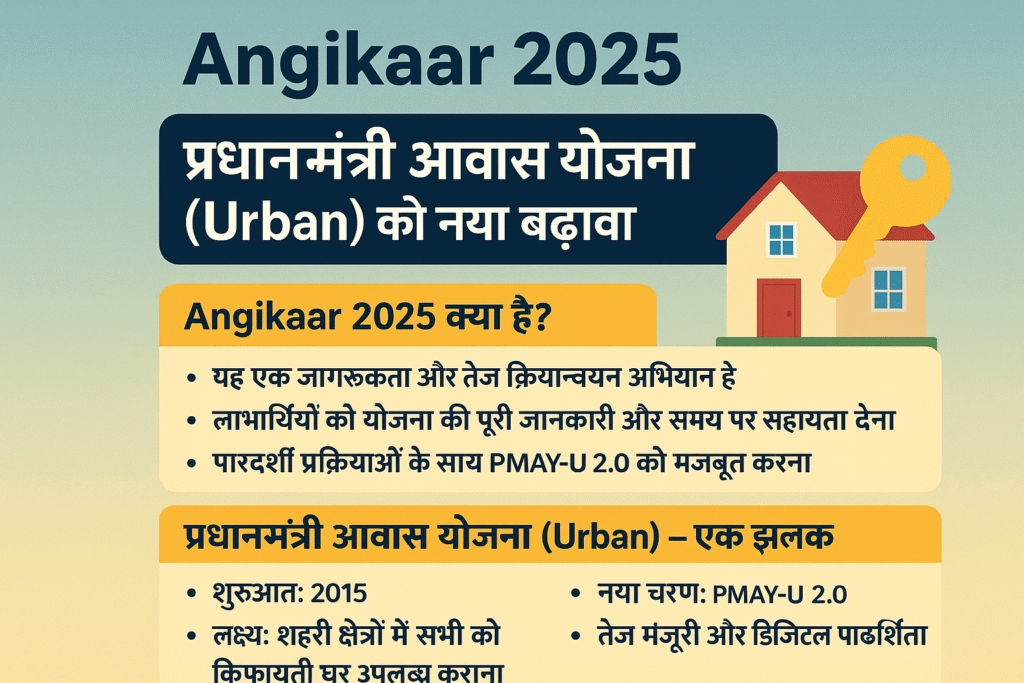 भारत में शहरीकरण तेजी से बढ़ रहा है और इसके साथ ही, शहरों में किफायती आवास की ज़रूरत भी बढ़ रही है। इसी को ध्यान में रखते हुए, गृह एवं शहरी विकास मंत्री मनोहर लाल ने एक महत्वपूर्ण अभियान की शुरुआत की है, जिसका नाम है ‘Angikaar 2025’। यह अभियान प्रधानमंत्री आवास योजना – शहरी (PMAY-U 2.0) के क्रियान्वयन में तेजी लाने और इसके बारे में जागरूकता फैलाने के लिए शुरू किया गया है।