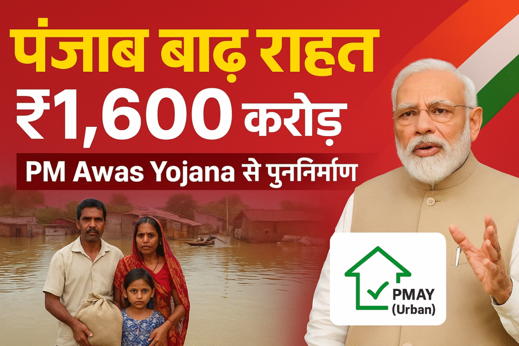 पंजाब में बाढ़ प्रभावितों के लिए केंद्र सरकार ने ₹1,600 करोड़ का राहत पैकेज घोषित किया। जानें PM Awas Yojana के तहत कैसे होगा पुनर्निर्माण और किसे मिलेगी वित्तीय सहायता।
